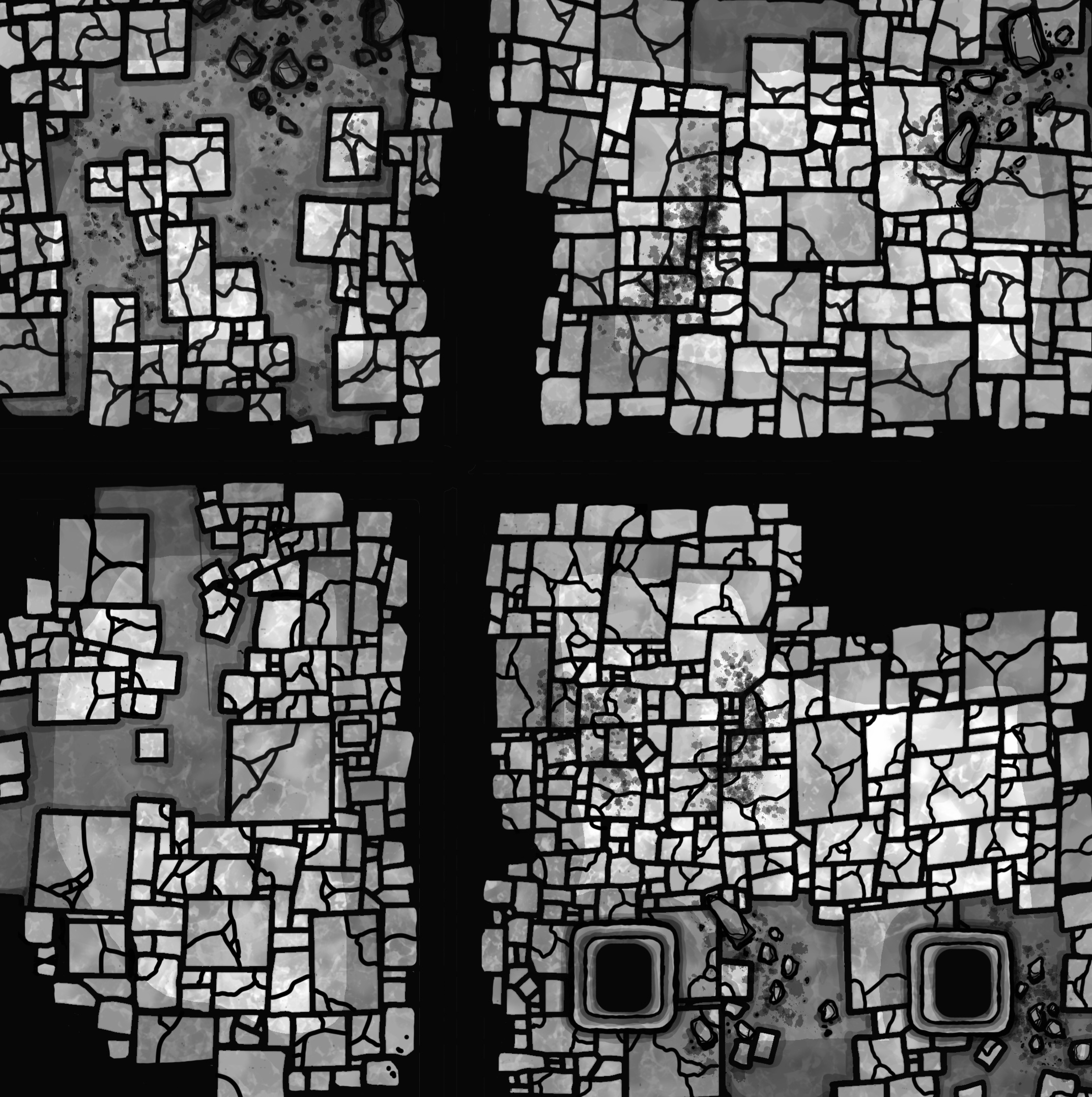 Six hand drawn, black & white, dungeon map tiles for table-top RPGs.